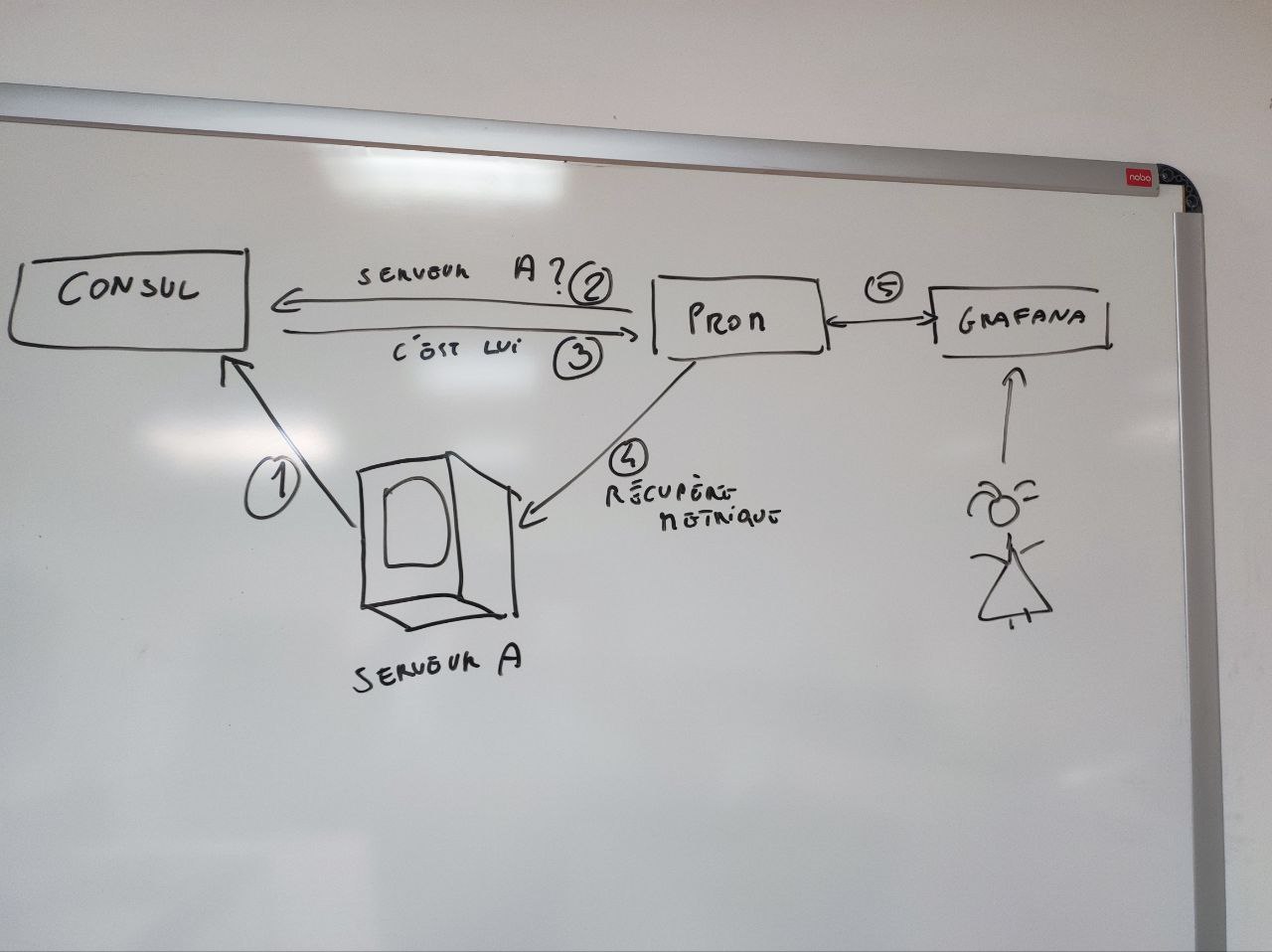 Toujours sur le serveur, un agent Consul possède une définition des services et des exporter associés, définition qu’il communique à un serveur Consul, ce dernier possède alors la liste de tous les services « clients » et donc des Exporters.