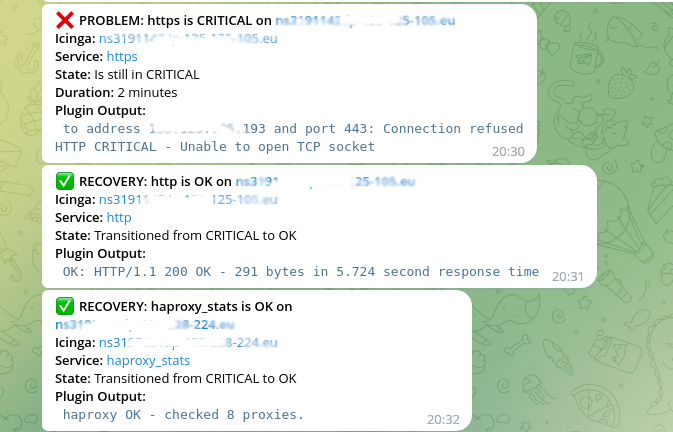 Les notifications d’alerting avertissent l’équipe technique du dysfonctionnement d’un service ou d’une anomalie dans l’élément surveillé. Chez Kokiris nous utilisons Telegram pour recevoir les notifications.